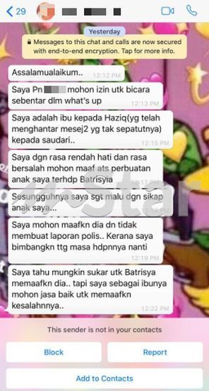 Mak lelaki tu ada WhatsApp saya merayu jangan ambil apa-apa tindakan atau buat laporan polis. Dia siap minta maaf bagi pihak anak dia.