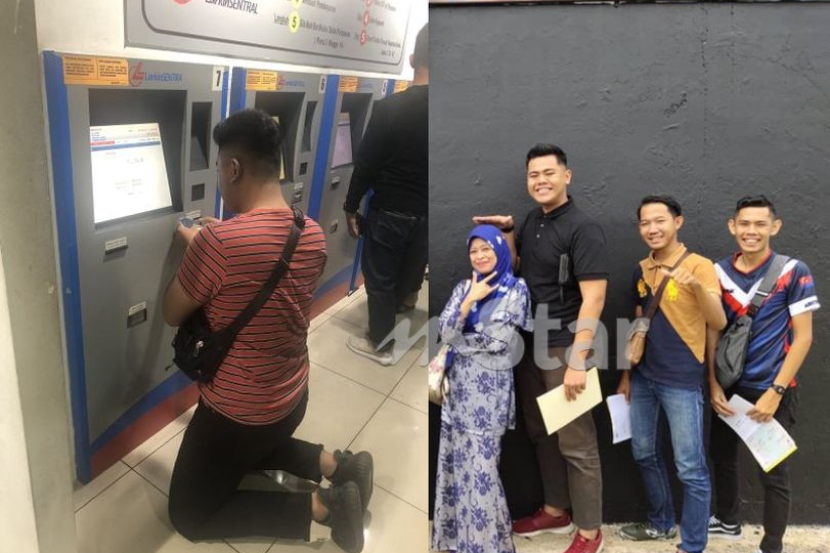 GELAGAT seorang pemuda melutut di hadapan kaunter mesin tiket bas menarik perhatian ramai apabila gambarnya itu dikongsi di media sosial.