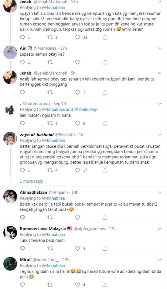 "Saya ada terbaca komen pengalaman orang lain tentang bayi terkena sawan mayat, terkenan atau bayi jadi terkejut. Jadi saya ketepikan dulu niat ini," ujarnya berkongsi keinganannya itu di Twitter.