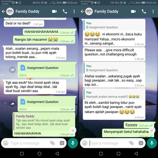 Menerusi perbualan tersebut, Nur Fatihah atau lebih mesra disapa Teha meminta bantuan ayahnya berkenaan tugasan atau assignment yang perlu disiapkan.