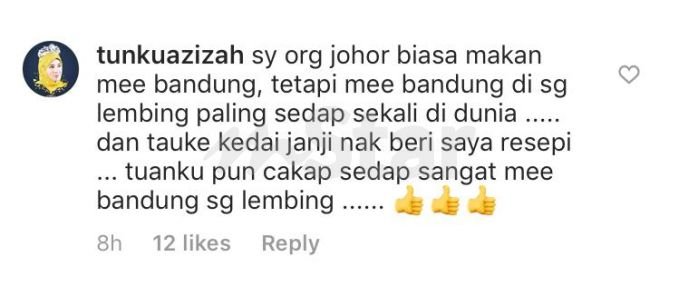 “Tuanku (Agong) pun cakap sedap sangat mi bandung Sungai Lembing,” tulis Tuanku menerusi akaun Instagram @tunkuazizah di ruangan komen pada salah satu posting di laman Instagram rasmi mStar @mstaronlineofficial, yang menunjukkan video ketibaan Agong dan Permaisuri ke kedai makan tersebut.
