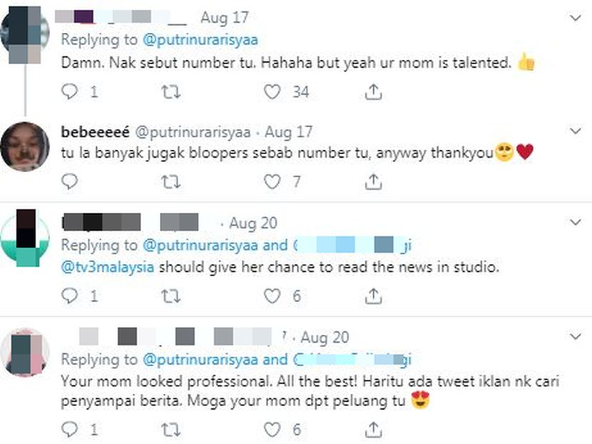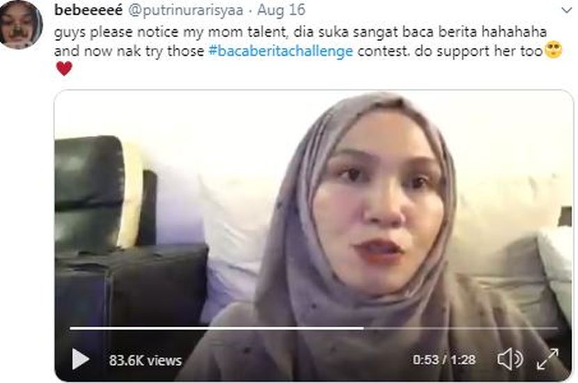 Posting pertama yang dimuat naik oleh anaknya di akaun Twitter pada 16 Ogos lalu mendapat lebih 6,000 ulang kicau (retweet) dengan kapsyen, "Korang tolonglah sedar bakat ibu saya, dia suka sangat baca berita. Dan sekarang nak cuba cabaran #bacaberitachallenge. Sokonglah dia juga".
