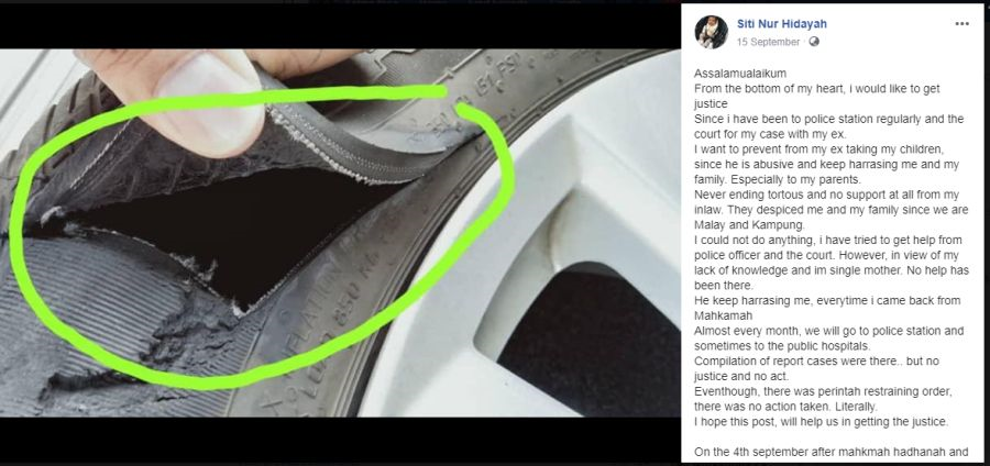 Posting di Facebook Dr Siti Nur Hidayah mengenai isu yang viral dan gambar tayar keretanya (kiri) yang ditoreh ketika menghadiri perbicaraan mahkamah baru-baru ini.