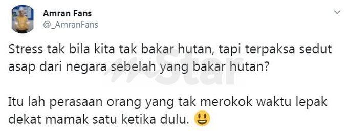 “Stres tak bila kita tak bakar hutan, tapi terpaksa sedut asap dari negara sebelah yang bakar hutan? Itulah perasaan orang yang tak merokok waktu lepak dekat mamak satu ketika dulu,” menurut perkongsian di laman sosial Tweetfamous @_AmranFans pada Rabu.