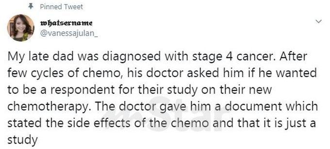 “Mendiang ayah saya didiagnosis dengan kanser tahap empat. Selepas beberapa pusingan rawatan kemoterapi, doktor yang merawat ayah bertanya sekiranya dia mahu menjadi responden untuk kajian mereka mengenai kemoterapi baharu.
