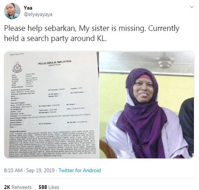 Turut tular satu posting yang dimuat naik oleh Hidayah Zainal pada 19 September lalu berkaitan berita kehilangan kakaknya dengan kapsyen, "Tolong sebarkan. Kakak saya hilang. Dan kini pencarian diteruskan di sekitar KL" mendapat kira-kira 2,000 ulang kicau (retweet) di laman Twitter.
