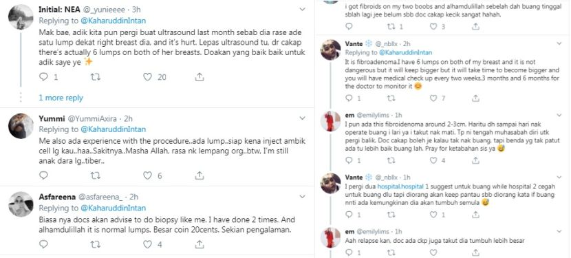 "Selepas jururawat memberitahu ada tiga ketulan, terus otak saya berfikir ia adalah kanser. Jelas doktor, dua daripada tiga ketukan itu merupakan 'cyst' dan satu lagi adalah lump, ia tidaklah terlalu besar hanya kurang satu sentimeter," jelasnya kepada mStar.