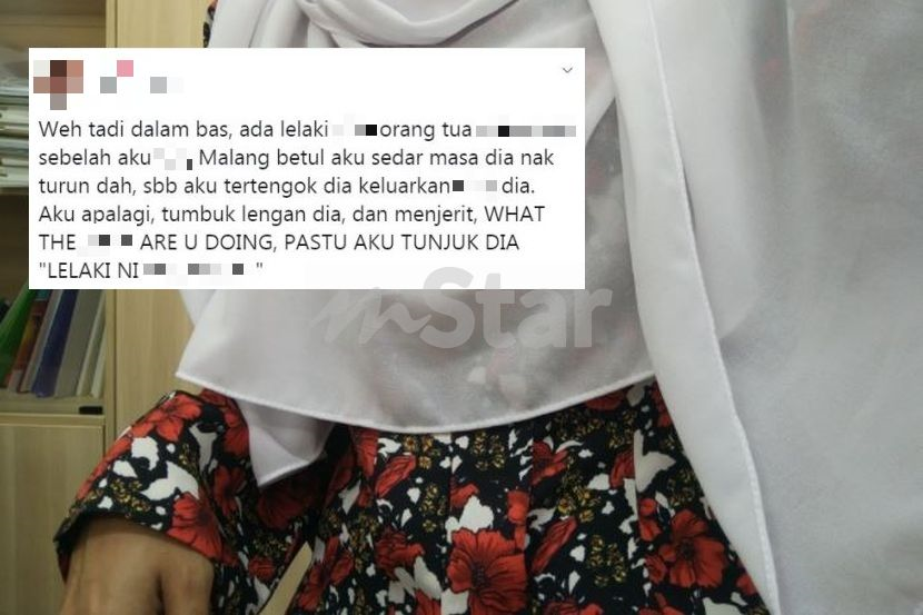 Menurut wanita itu, seorang lelaki yang duduk di sebelahnya di dalam bas menunjukkan kemaluannya sambil melakukan perkara tidak senonoh.