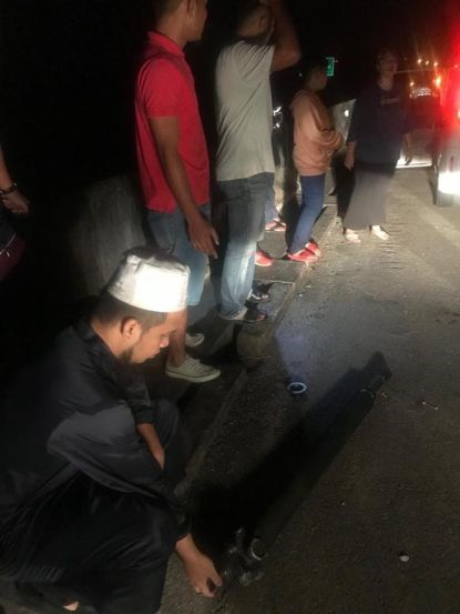 "Kira-kira 2 pagi tadi (Ahad) accident dari Pulau Pinang. Langgar besi besar panjang. Lima kereta berturut. Saya pertama langgar.Tapi rahmat Allah malam ni saya jumpa seorang India, Tiyahgah Raja. Baik sangat orangnya.