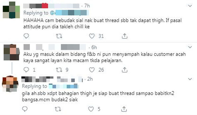 Baru-baru ini, tular satu posting yang dimuat naik oleh seorang lelaki menerusi akaun Twitter miliknya dengan kapsyen, 'Ni aku nak cerita, kedai Melayu jual nasi ayam. Aku nak bahagian thigh (atas paha), dia boleh cakap tak ada. Yang lagi tiga ekor ayam tergantung tu apa benda?! Kau malas nak potong baru, lepas tu kedai tak laku cakap kena bomohlah, ni semua salah Yahudilah, Melayu tak tolong Melayulah'.