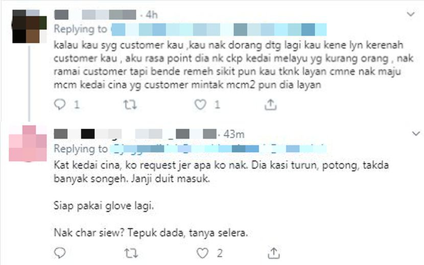 "Ni kalau Cina jual elok je bawa turun baru punya dan potong untuk bagi aku thigh. Ni pertama kali dan terakhir aku beli dari kau. Tolonglah Melayu, sampai bilalah nak macam ni.