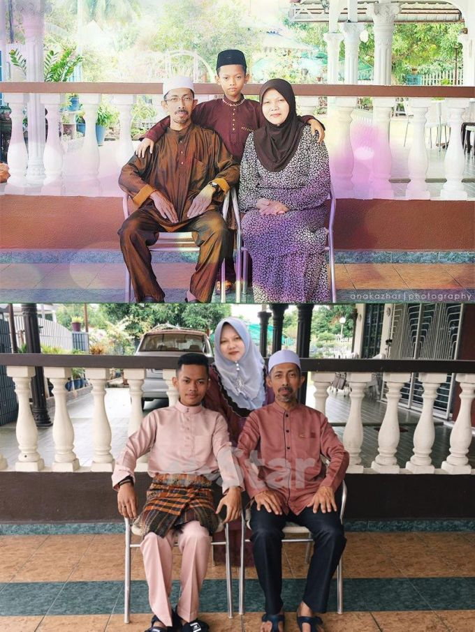 “Kemudian masa raya tahun ini saya minta ayah bergambar bersama di lokasi yang sama, di lokasi yang sama menggunakan kerusi yang sama. Bezanya cuma kedudukan saya dan mak di kedua-dua gambar,” katanya.