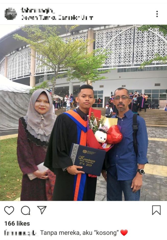 “Sebenarnya majlis konvokesyen tu hanya ada ayah dan ahli keluarga lain yang datang. Mak dah meninggal dunia, cuma saya sunting ‘masukkan’ arwah mak dalam gambar itu untuk nampak seolah-oleh dia turut ada.