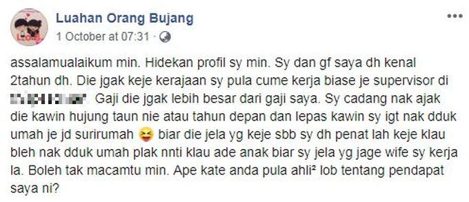“Saya cadang nak ajak dia kahwin hujung tahun ni atau tahun depan. Lepas kahwin saya ingat nak duduk rumah je jadi suri rumah,” menurut perkongsian seorang pemuda di halaman Facebook ‘Luahan Orang Bujang’ (LOB).