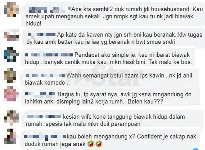 “Kau boleh mengandung tak? Confident je cakap nak duduk rumah jaga anak,” ujar seorang netizen yang mempersoalkan hasrat pemuda itu.