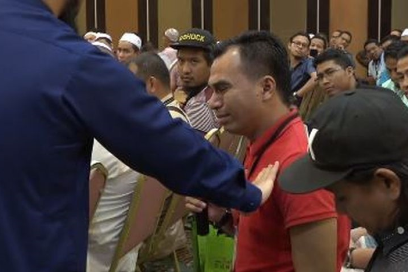 Suasana majlis bertukar hiba apabila lelaki itu keluar tanpa mengenakan kasut menuju ke bahagian belakang untuk berjumpa dan memeluk isterinya sambil meminta maaf.