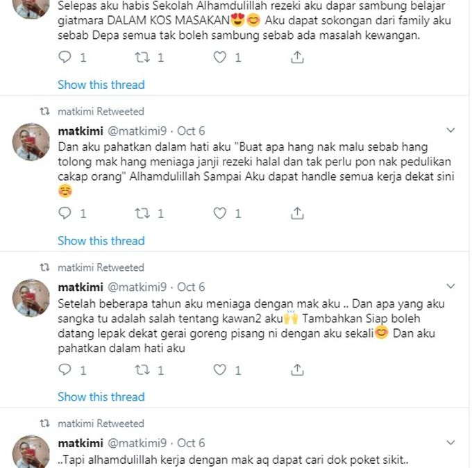 "Dan saya bersyukur juga rezeki keluarga saya sekarang agak lancar berkat doa dan usaha semua orang. Mak pun dah mulakan perniagaan kecil-kecilan menjual kuih sejuk beku seperti cucur badak, karipap dan sebagainya.