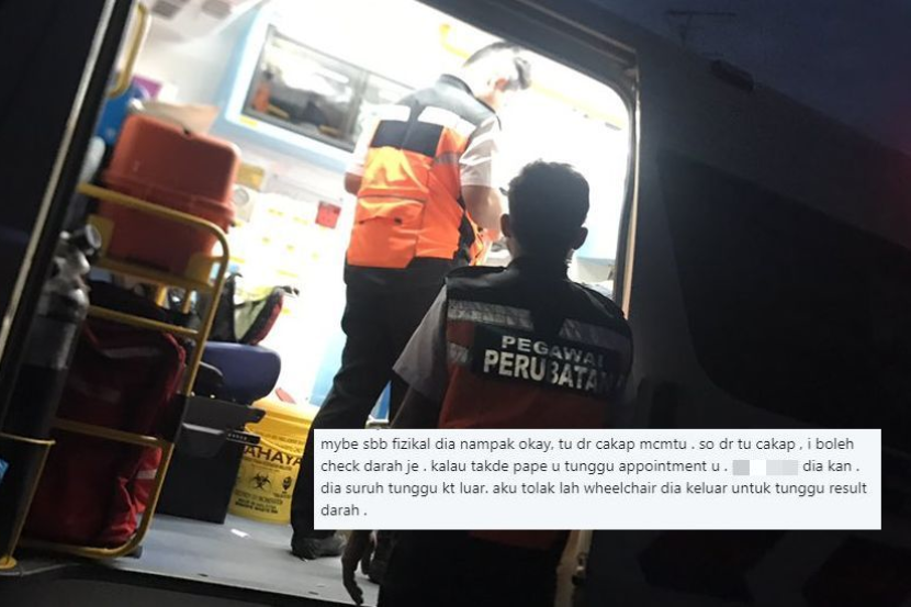 "Tak ada pilihan, aku telefon ambulans. Mereka cakap tak ada ambulan kosong, semua keluar. Lepas tu dengan soalan dia ada dalam 10 minit dia tanya aku, teruk ke dia? Dia boleh jalan ke? Dia sakit apa je? Aku cakap kalau tak teruk, aku tak telefon ambulans," katanya menerusi bebenang.