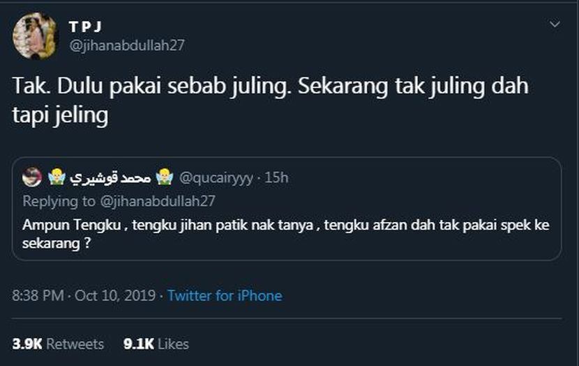 "Tak. Dulu pakai sebab juling. Sekarang tak juling dah tapi jeling," tulis Puteri Jihan dalam nada berseloroh.