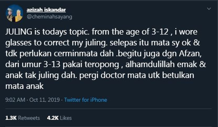 Saya pun juling juga, menurun kepada Afzan. Bukan juling air tapi juling teruk, pakai cermin mata dari umur tiga hingga 12 tahun nak straight kan mata. Juling itu menawan.