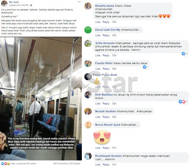 "Tiba-tiba sekumpulan lelaki macam berkumpul dekat hujung koc bawa sejadah. Rupa-rupanya mereka nak solat berjemaah," katanya yang menyambung pengajian peringkat Doktor Falsafah (PhD) di USM, Pulau Pinang.