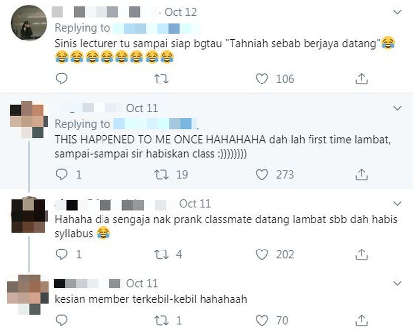 Tular satu posting yang dimuatnaik oleh seorang pelajar di laman Twitter miliknya pada Jumaat dengan kapsyen, 'Akibat datang lambat lagi,' mendapat perhatian ramai dengan meraih kira-kira 18,500 ulang kicau (Retweet) serta 13,100 suka (like).