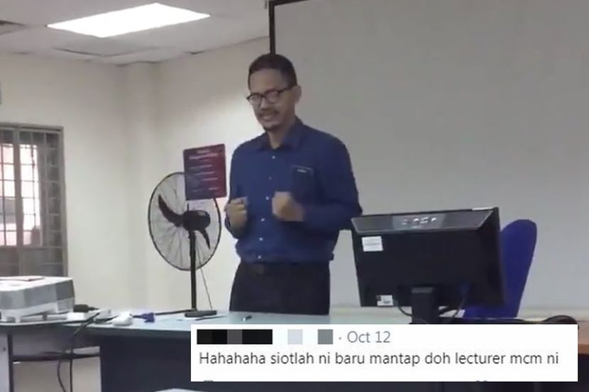 Menerusi posting tersebut, satu video berdurasi 00:34 saat turut dimuatnaik, memaparkan seorang pensyarah 'mengusik' dua pelajarnya dengan mengucapkan tahniah kepada mereka kerana berjaya hadir ke kelas.