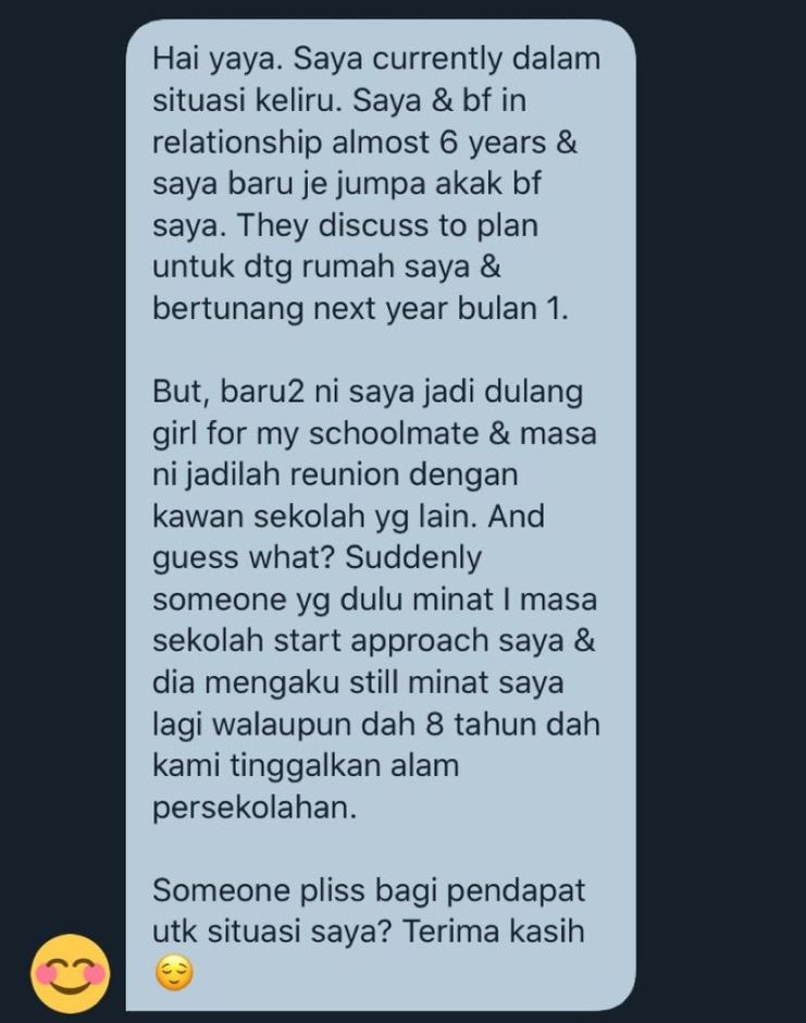 "Dan cuba teka? Tiba-tiba seseorang yang dulu minat saya masa sekolah mula mendekati dan dia mengaku masih minat saya," tulis gadis itu.
