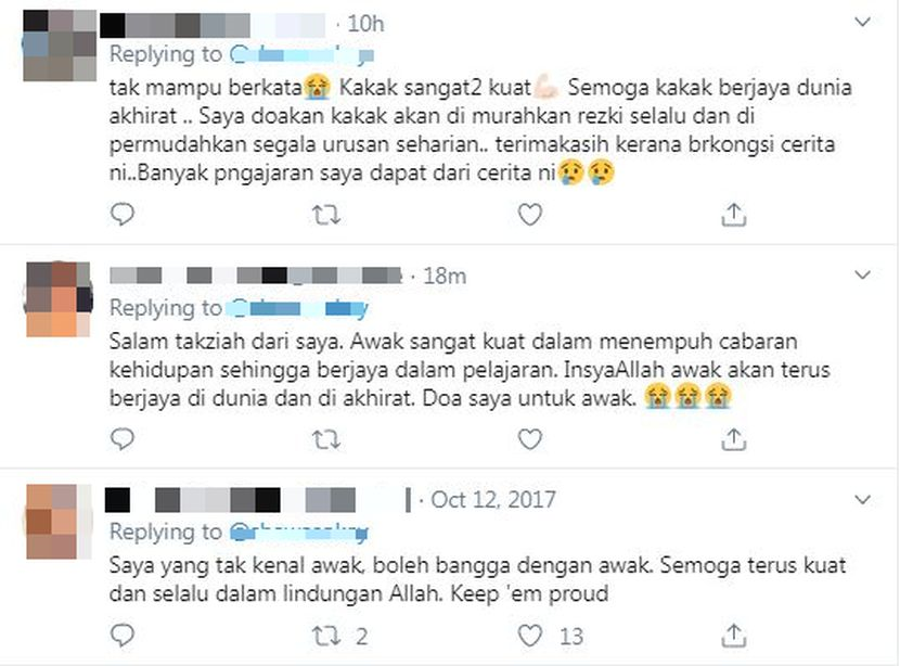 "Sebenarnya ramai juga tanya macam mana saya boleh sambung belajar lepas mama dan abah meninggal. Pertama, saya guna duit simpanan sepanjang saya tinggal di rumah anak yatim. Itulah yang jadi bekal saya. Tapi tu semua memang tak cukup, dan hanya bertahan sampai hingga semester tiga.