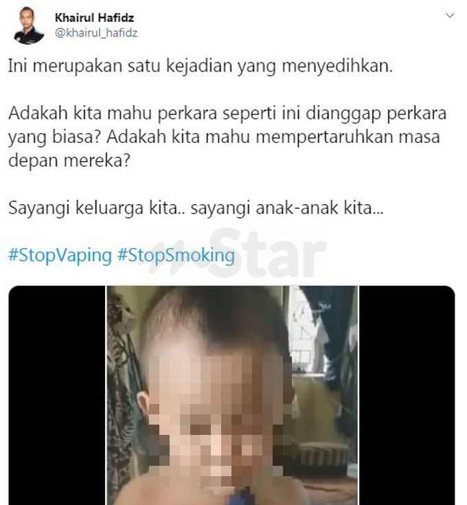 “Adakah kita mahu mempertaruhkan masa depan mereka? Sayangi keluarga kita.. sayangi anak-anak kita,” menurut perkongsiannya di laman Twitter khairul_hafidz dengan tanda pagar #stopvaping (berhenti menghisap vape) dan #stopsmoking (berhenti menghisap rokok).