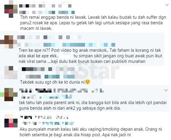 “Tak tahu lah pada ibu bapa anak ni, dia bangga kot bila anak dia lebih cepat pandai guna benda alah ni daripada anak-anak yang sebaya dengan anak dia,” ujar yang lain.