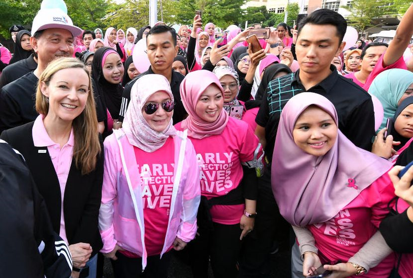 Tunku Azizah (dua, kiri) berkenan menyertai larian santai 'KL Pink October Walk 2019' di Hospital Kuala Lumpur pada Sabtu. Foto Bernama
