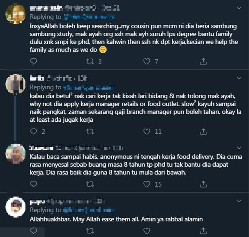 Ia sehingga kini menerima lebih 7,300 ulang kicau (Retweet) dan turut dihujani komen yang meminta agar dia bersabar dan terus berusaha.