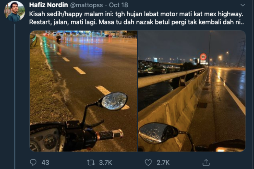 “Saya dalam perjalanan pulang dari tempat kerja di KLCC menuju ke Puchong. Sebaik sahaja melepasi tol di MEX, motosikal saya buat hal.
