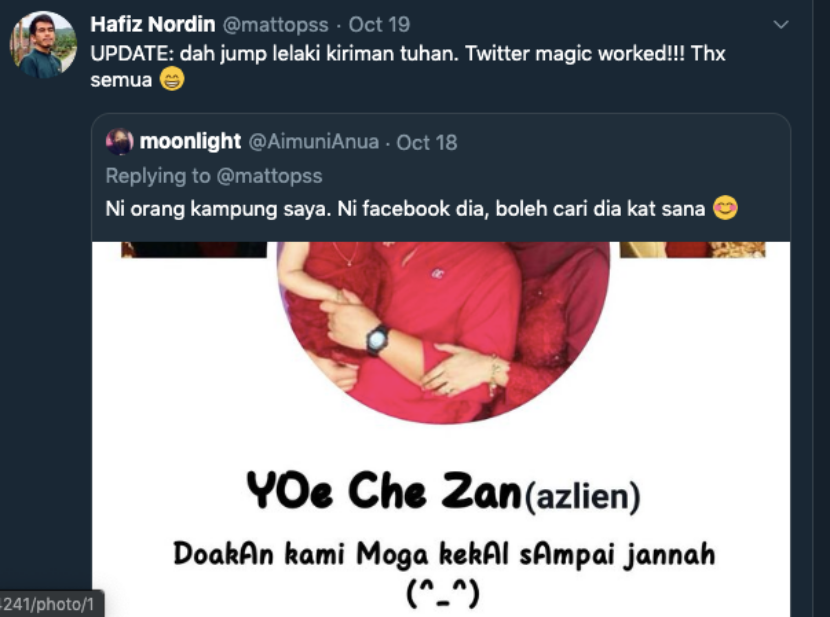 “Dia hanya memperkenalkan dirinya sebagai ‘Abang Yeo’ sahaja. Apabila sampai di rumah saya nak hulurkan sedikit duit, tetapi dia tolak.