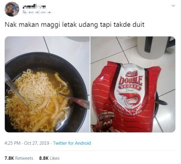 Namun begitu, perkongsian gadis ini di Twitter yang memuat naik gambar semangkuk mi segera yang ditabur dengan makanan ringan mencuri perhatian netizen, sehingga ia meraih 7,800 retweet.
