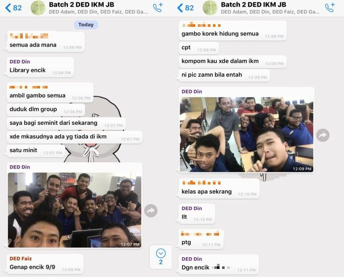 “Ambil gambar semua, duduk dalam kumpulan. Saya bagi seminit dari sekarang. Kalau tak ada maksudnya ada yang tiada di IKM,” kata pensyarah terbabit yang merujuk kepada Institusi Kemahiran Mara (IKM), sebelum dibalas dengan sekeping gambar sembilan pelajar.