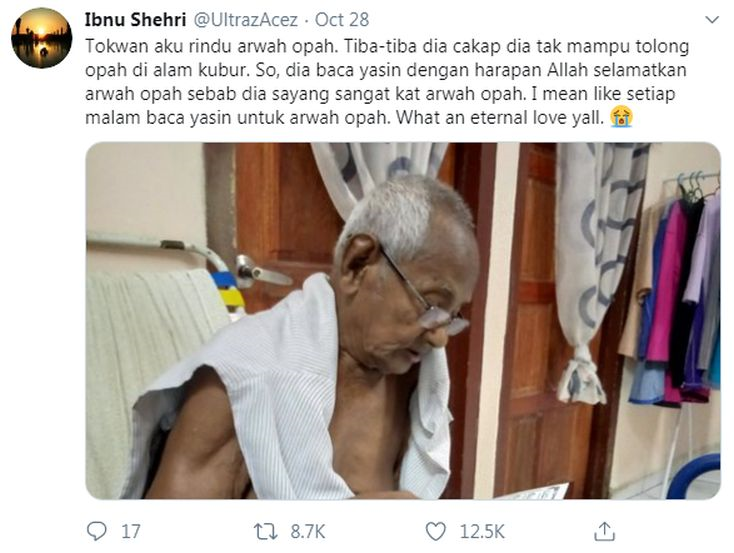Perkongsian Muhammad Habib mengenai kisah tokwannya membaca surah Yasin untuk arwah opahnya setiap malam mendapat 8,600 ulang kicau dan 12,500 tanda suka.