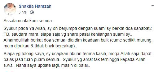 “Sehingga kini (berita ditulis) dia masih tak menceritakan apa yang berlaku sepanjang kehilangannya. Saya juga enggan terlalu memaksa. Dia juga enggan berjumpa dengan siapa-siapa pun buat masa ini. Nantilah biar suami berehat dahulu. Yang penting saya bersyukur suami pulang dengan selamat,” ujarnya.