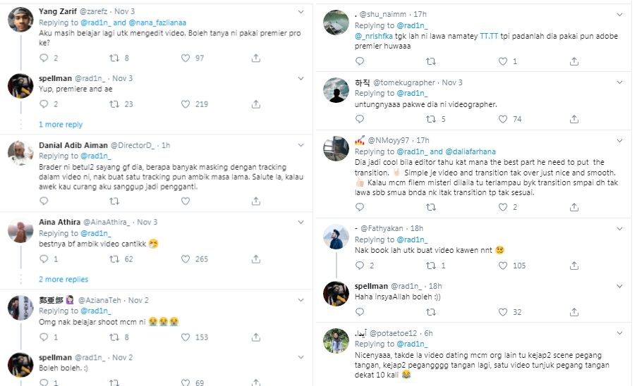 Apa yang lebih membuatkannya tidak sangka apabila ada di antara netizen yang menghubunginya menerusi Direct Message (DM) di Twitter dan bertanyakan mengenai teknik mengambil video dan suntingan kerana kagum dengan video yang dihasilkan itu.