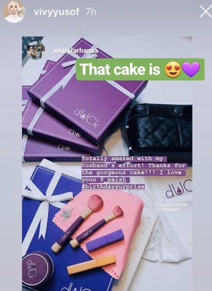 Gambar kek dan tudung Duck yang dimuatnaik isteri Muhammad Faiz turut dikongsi oleh Datin Vivy Yusof, pengasas jenama berkenaan di Instagram.
