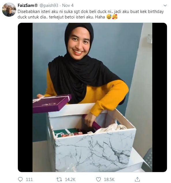 Lelaki itu menghadiahkan isterinya beberapa helai tudung Duck, selain turut membuat kejutan dengan menempah sebiji kek yang menyerupai kotak tudung dari jenama terkenal itu.