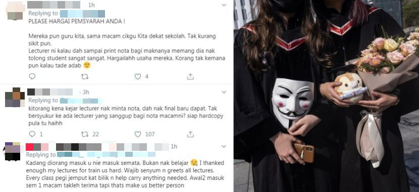 "Eee... biadabnya. Aku tanpa nota tak boleh hidup tau walaupun kami sendiri yang kena photostat. Sanggup keluarkan duit nak photostat nota tebal-tebal. Ni pensyarah bagi free pun angkuh tak nak ambil apa bendalah punyai perangai," kata netizen menerusi ruangan komen.