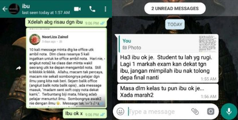 Malah ibunya turut memuatnaik posting di laman Facebook mengatakan, 10 kali mesej minta datang ke office untuk ambil nota. Dalam kelas rasanya lima kali ingatkan untuk ke office ambil nota. Masih krikkk krikkk... Allahu, macam tak percaya, macam ni sekali sombongnya pelajar dengan ilmu yang kita nak beri.