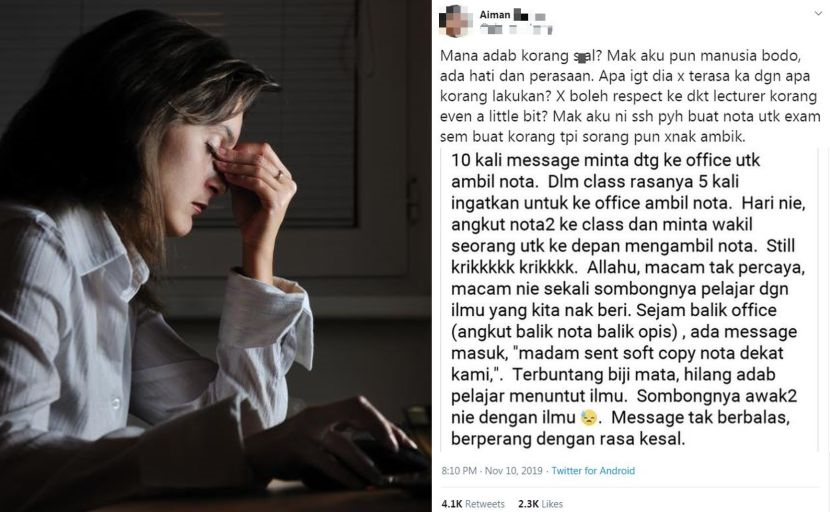 'Tak boleh hormat ke dekat pensyarah walaupun sedikit? Mak aku ni susah payah buat nota untuk ujian semester kamu, tapi sorang pun tak nak ambil'.