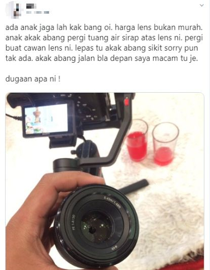 “Masing-masing ada silapnya. Mungkin salah saya juga sebab letak barang di situ. Mungkin sebab rasa ia tempat yang selamat, sebab dah berpuluh job wedding yang saya buat, memang macam itu saya letak lens sebab senang nak tukar-tukar. Tapi inilah kali pertama jadi seperti ini.