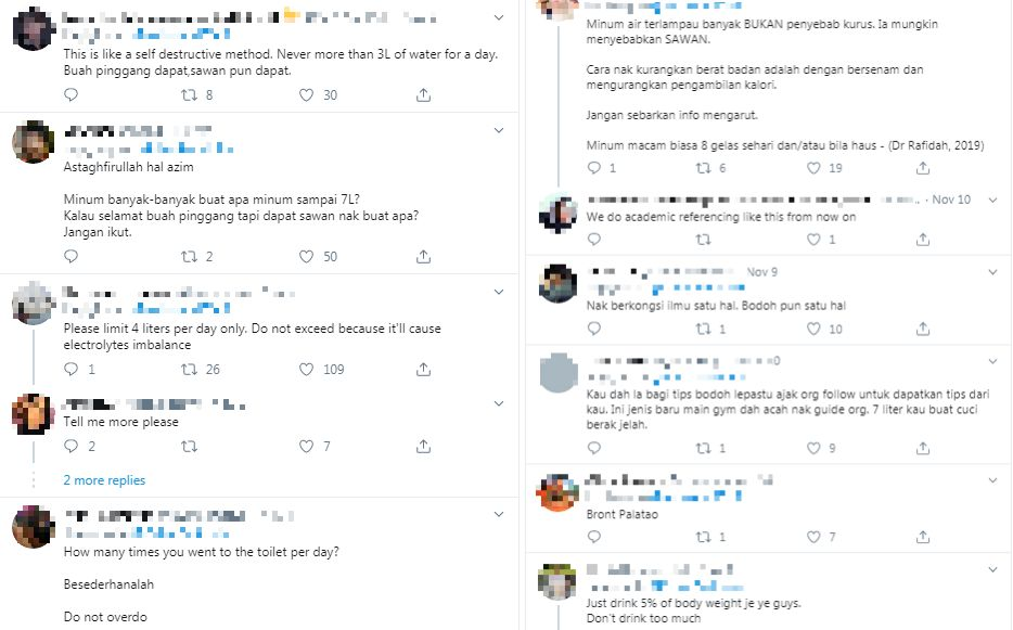 Ini gara-gara perkongsiannya di Twitter mengenai pengambilan sebanyak tujuh liter air putih sehari, yang mana netizen menyifatkan tip tersebut hanya akan membahayakan kesihatan.