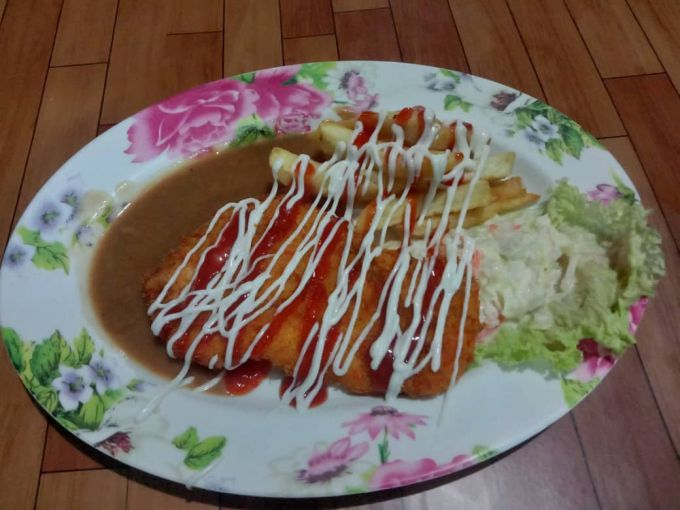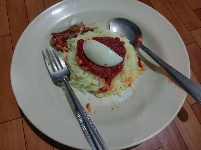 “Nasi lemak dijual RM1. Set chicken chop dijual serendah RM3, lengkap dengan kepingan ayam, kentang goreng, coleslaw, salad, ada mayonis berserta sos cili dan sos lada hitam.
