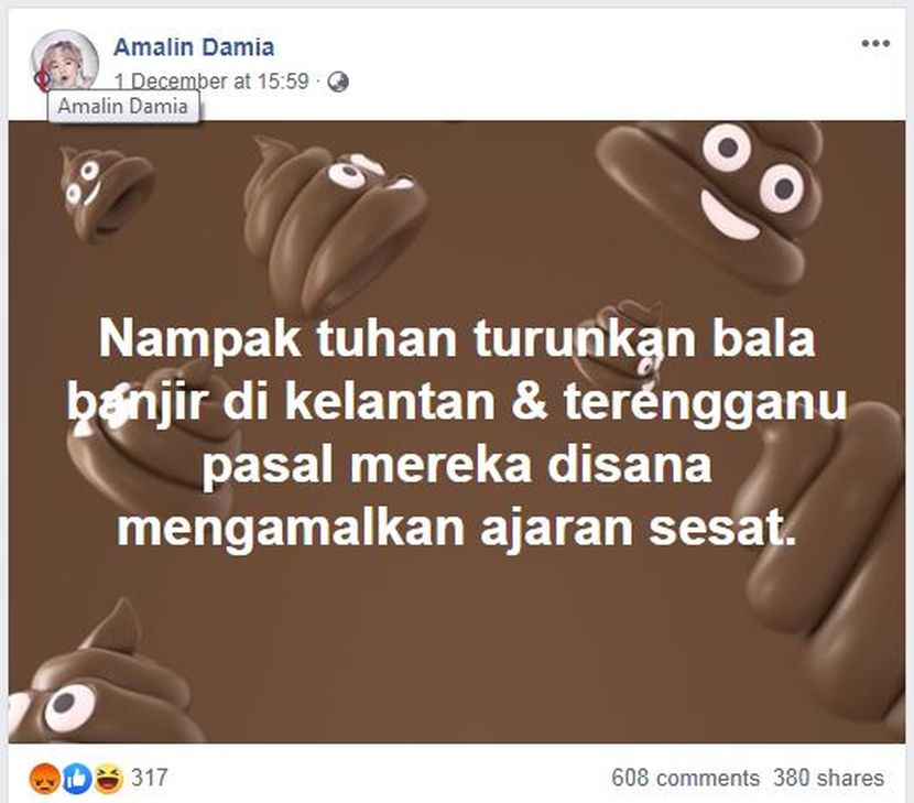 Posting Facebook seorang individu menggunakan nama Amalin Damia pantas menjadi tular sehingga dihujani pelbagai kecaman netizen.