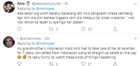 "Pembantu rumah nenek saya menjaganya di Kelantan selama tujuh tahun, bertukar slanga Indonesia kepada Kelate. Amat menyeronokkan melihat perkara seperti ini berlaku," tulis Dihah.